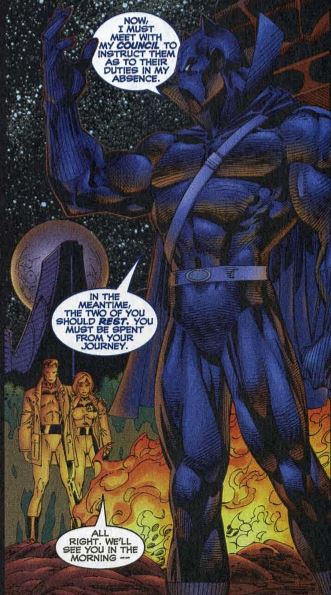 Reed and Sue meet with King T’Challa of Wakanda, who says he too is investigating the anomaly. He dons the garb of the Black Panther, saying he is not just king but “warrior avatar” of the Wakandans. The heroes investigate the jungle along with a bunch of Wakandan warriors. They are attacked by a mysterious lizard creature, who leaves behind an explosive device. Sue protects her and Reed with a force field.