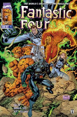 Reading the Fantastic Four comics from the start. In Heroes Reborn: Fantastic Four #4 (a.k.a. vol. 2 #4), in which superstar artist Jim Lee continues to recreate the Marvel Universe by making it just like the regular Marvel Universe.