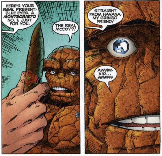 Clobberin’ time: Ben’s cigar is a relic of the past. Marvel’s ban on smoking started in 1990 when the company banned images of smoking in trading cards, and then in 2001 the company announced that characters would no longer smoke in the comics, with Wolverine, the Thing, Nick Fury, and Gambit being singled out by name. Later, in 2015, Disney executive Bob Iger announced that smoking would no longer appear in the Marvel Cinematic Universe.