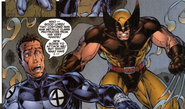 Unstable molecule: Reed’s vision is a scene from the Fantastic Four vs. X-Men miniseries. Wolverine refers to Kitty Pryde, whom Reed was trying to help at that time. It’s not clear why this moment was chosen for Reed to relive out of all his memories, except that Wolverine sells comics.