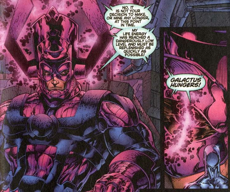 Cut to outer space, where the Silver Surfer reunites with Galactus. The Surfer says that Earth is different from all other planets Galactus has harvested. He asks for further investigation. Galactus refuses, however, saying his hunger is too great. A disappointed Surfer can only say, “Very well, master.” On the last page, the Watcher speaks directly to the reader, saying he always watched and never interfered… until now.