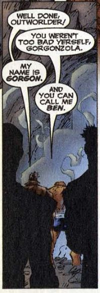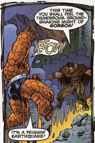 Ben wants to start a fight, but is throttled by Gordon (who, let’s not forget once singlehandedly defeated the entire Fantastic Four). Ben breaks free and the battle begins. Ben goes after Black Bolt, who throws Ben around with awesome super-strength. Reed and Medusa are evenly matched with the stretching/hair powers. Karnak can’t break through Sue’s force fields, and then Gorgon goes after Ben again. Reed and Ben do the old slingshot routine to drive back the Inhumans, and then Sue turns all three of them invisible for a quick escape.