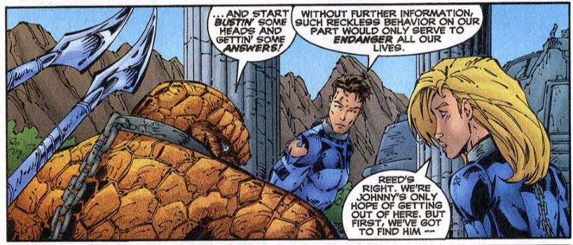 Clobberin’ time: Reed tells Ben to execute plan “Romeo-Charlie-Able,” which a caption tells us is “retreat and counter-attack.” Ben has no idea what this is, though, revealing he hasn’t been paying attention in the FF’s training sessions.