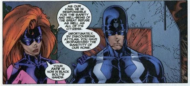 The FF are led into the Inhuman throne room. They meet up with the royal family and a whole bunch of other Inhumans. Also, the throne room contains giant sculptures of Galactus and his heralds, with Reed theorizing that the sculptures represent the Inhuman gods. Medusa speaks on behalf of Black Bolt, saying that Johnny is safe with the Inhumans’ healer, and that he and the FF have jeopardized the secrecy and sanctity of the Inhumans’ home, which has been safely hidden for two thousand years. Sue promises that the Inhumans’ secret will be safe with the FF. Medusa isn’t buying it, and says the FF must never leave the city.
