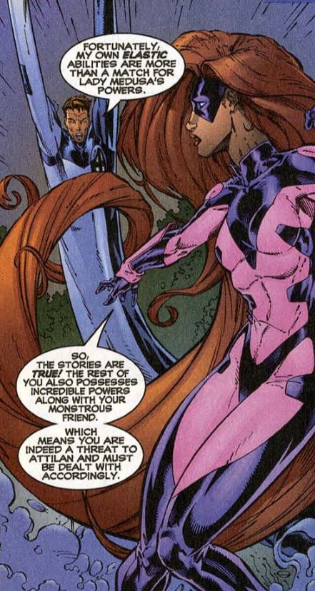 This issue suggests that in the Heroes Reborn universe, Medusa’s hair is not just alive, but can stretch with equal power as Reed’s, so that she can keep up with him in a fight.