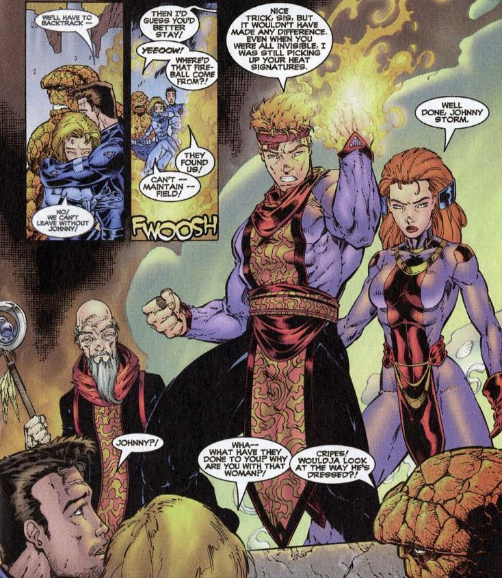 As Reed, Sue, and Ben sneak out of the city, they’re found by Johnny and Crystal. Johnny is dressed in weird Inhuman robes that match Crystal’s outfit. At first, the others believe Johnny has betrayed them and sided with the Inhumans. Johnny cautions his teammates not to jump to conclusions, and that the Inhumans don’t want to imprison the FF. Instead the Inhumans want the FF’s help.