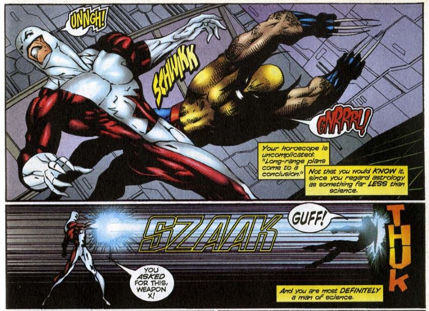 Wait, there’s more: This issue contains a four-page preview of 1998’s Alpha Flight #1, a flashback scene of AF’s leader Guardian training Wovlerine, back when Wolvie was in Alpha Flight as “Weapon X” before becoming a fugitive and finally ending up with the X-Men. Guardian thinks he has the upper hand on Wolverine, only for Wolverine to surprise him and almost lose control and kill him. If this is a flashback, why is Guardian called Guardian and not his original codename, Vindicator? Because the final panel reveals this is a dream Guardian is having. He fears that although he is alive again and Alpha Flight is back, there might be bad times coming. (And, in case anyone’s wondering, this series took place in the regular Marvel Universe and not the Heroes Reborn universe.)
