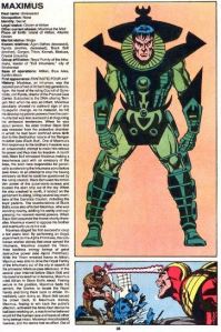 Trivia time: What are Maximus’ powers, again? For this, we turn once again to our old friend The Official Handbook of the Marvel Universe: Deluxe Edition. The handbook tells us Maximus can “override the thought processes of other brains around him.” This isn’t exactly mind control, but the power to numb minds and sometimes influence behavior. This is why he’s often surrounded by the Alpha-primitives. Because they are so animalistic, he can mentally command them much easier. As far as this issue goes, I think we can assume he went through his own machine to amplify his powers so he can throw around psychic blasts. Of course, Maximus also has a genius-level intellect. Maximus’ portrait in the Handbook was drawn by Tom Palmer.