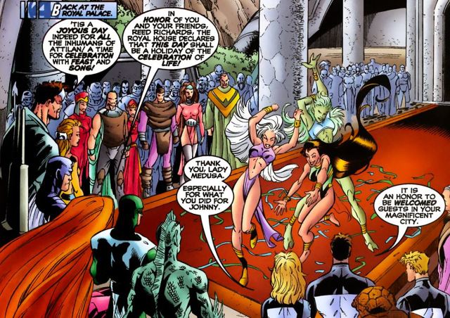 Cut to later, when the FF are honored guests at an Inhuman celebration, complete with scantily-clad dancing girls. Medusa says the FF have their freedom, as they’ve proven themselves to be friends of the Inhumans. Johnny and Crystal have a romantic kiss goodbye with Ben, Karnak and Gorgon spy on them. Then we see Maximus in a straightjacket in what appears to some sort of Inhuman hospital. He’s ranting about how it’s too late, and the great devourer is coming.