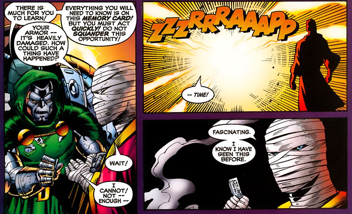 Then there’s an epilogue in Latveria, where Dr. Doom is nearly recovered from injuries following his fight with the FF and the Silver Surfer a few issues back. A second Dr. Doom, with more technologically advanced armor, teleports into the room, gives Doom a keycard and then vanishes. Doom realizes that this is an improved version of a keycard for his newest project, a “chrono-displacement mechanism. “Most intriguing,” he says.