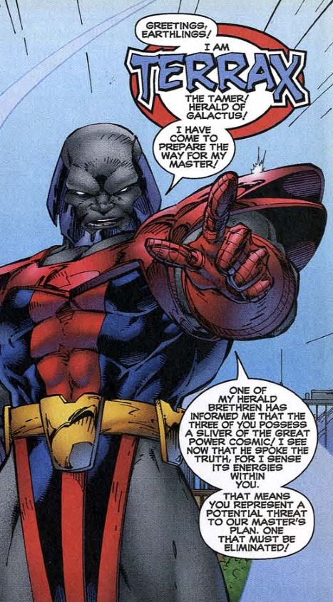 Unstable molecule: Terrax refers to Reed as “Elastic Man.” Poking fun at DC characters again, are we?
