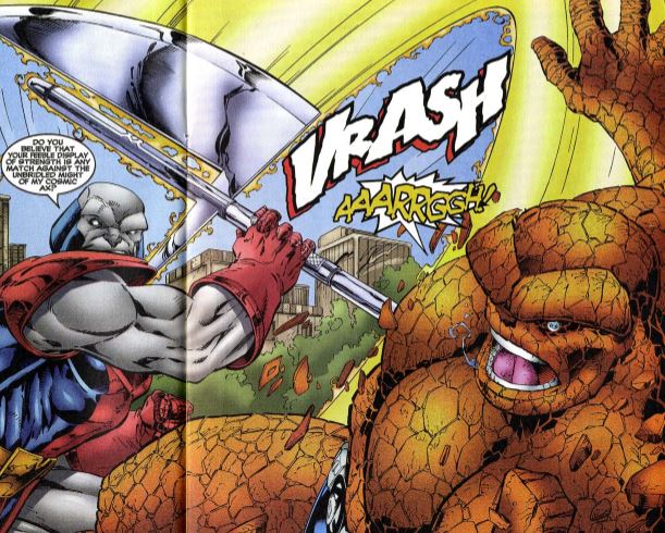 The fun at Central Park is interrupted by Terrax the Tamer, another herald of Galactus. Terrax says the FF possess a threat to the Galactus’ Power Cosmic, so he’s sought them out personally. Terrax attacks Ben, using his axe open Ben’s rocky hide. Ben admits that Terrax actually hurt him. Reed and Sue join the fight, and are easily subdued by Terrax’s earth-bending powers. Sue tries to contact Johnny, but he left his communicator in the Danger Room, and is in another room still pining for Crystal.