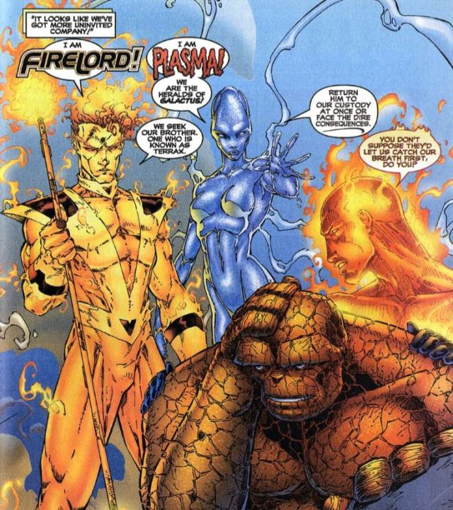 Sue was injured in the fight, and Reed carries her off to help her, with Ben learning that Sue is now pregnant. Before Ben can react, two more of Galactus’ heralds show up, Firelord and Plasma. Johnny asks for a moment to catch their breath before the next fight, but Ben says he doesn’t think it would make much difference.