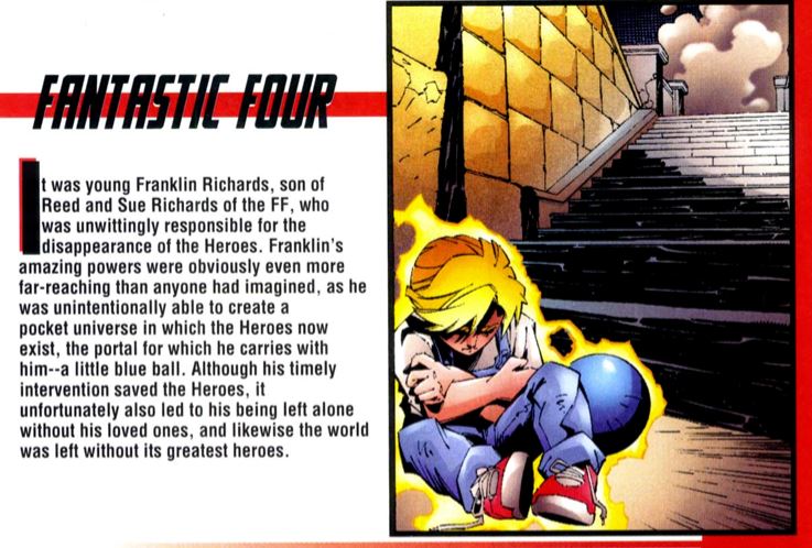 Reading the Fantastic Four comics from the start. When the Heroes Reborn reboot fell below expectations, Marvel was quick to re-reboot it. Time for the FF, the Avengers, and more to reenter regular Marvel continuity, and it was decided that the FF’s own Franklin Richards as the reason for it all, hence the notorious Heroes Reborn: The Return.