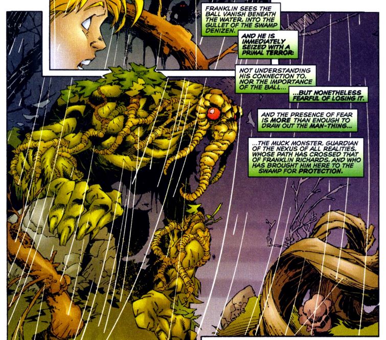 After Onslaught, Franklin spent a short amount of time as a supporting character in Cable, where it looked like Cable might become his new father figure. Franklin next showed up, however, in Generation X, finding a new home at the Xavier School. When the school was attacked, he and a bunch of others fled to the nexus of all realities, home of Man-Thing. There, they formed their own super-team, the Daydreamers. That’s all well and good, except that through this all, Franklin can be seen carrying around a blue sphere, which he’s had since the last issue of the Onslaught event. This sphere contains the HRU, but for the life of me I can’t figure out when this was officially revealed. After a while, it’s as if readers are just meant to pick up on it. If anything, it looks to me like the fact that Franklin created the HRU wasn’t revealed in a story, but in all the ads for this event. Whatever. Let’s just get on with the story.