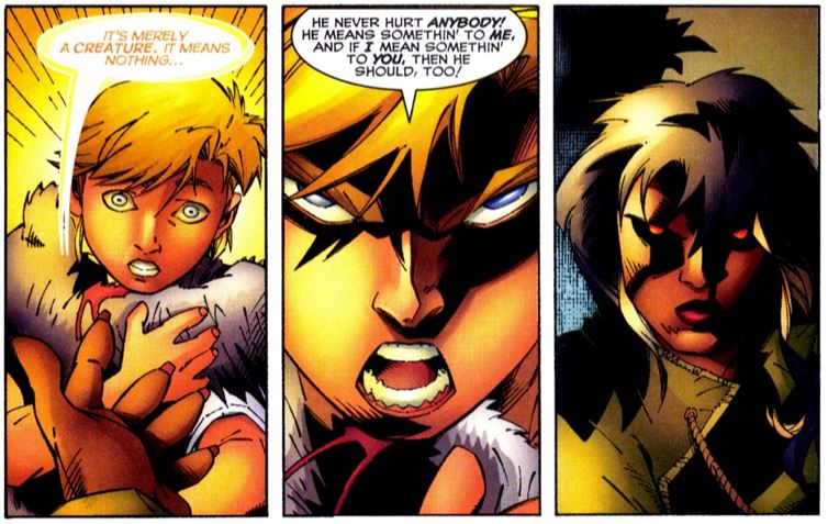 In another wilderness, Franklin and Ashema talk some more. He doesn’t want to destroy an entire universe full of people’s lives. They find a wounded bear cub, and Franklin insists Ashema use her powers to heal it. She does, but then turns around and kills it right in front of him. Angered, Franklin lashes out at her with his own power. She says that Franklin can’t make his choice, the Celestials will make it for him.