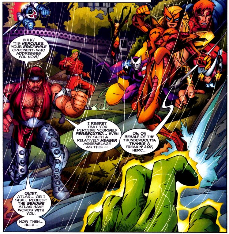 Back in New York, the Hulk is now fighting Spider-Man, Hercules and the Thunderbolts in Central Park, when Dr. Strange appears. Spidey and the Hulk are both drawn into the sphere, teleporting themselves to the HRU, where the Hulk is confronted by… another Hulk!