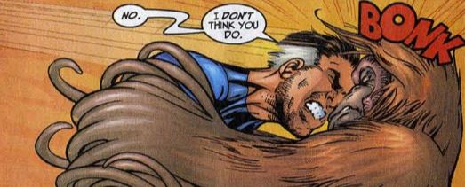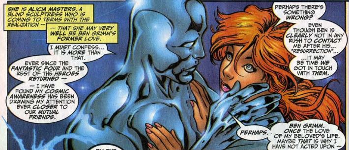Cut to outer space, where readers are reunited with Alicia Masters. Readers who haven’t been following Silver Surfer during this time might not know that Alicia has been a supporting character in that comic for a time, and some might really be surprised to learn that Alicia and the Surfer have become a romantic couple by this point. The Surfer tells Alicia that his thoughts dwell on Earth after learning that the heroes who died/disappeared during Onslaught and Heroes Reborn have returned. Alicia says that although Ben has made no effort to contact her, she wonders if it’s time for her to get in touch with him. Then the Silver gets another premonition of Earth, saying that something is growing deep within the Earth, which may pose a threat to the planet.