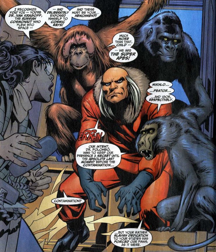 Back in NYC, we’re at Empire State University, where we meet security guard Devin Chapman, who thinks of himself as a crimefighter called “Campus Defender,” and grad student Cathy Polombo, who is studying biopsy results on a test monkey. She discovers synthetic fibers in the monkey’s muscles and strange readings in its blood. She calls her student advisor, a “consulting professor,” and leaves a message. A voice tells her to hang up the phone. Cathy turns to face the Red Ghost and his Super-Apes. Note that the Super-Apes are now intelligent and can speak, while the Red Ghost only grunts and acts ape-like. The apes introduce themselves as Mikhlo, Peator (the gorilla), and Igor.