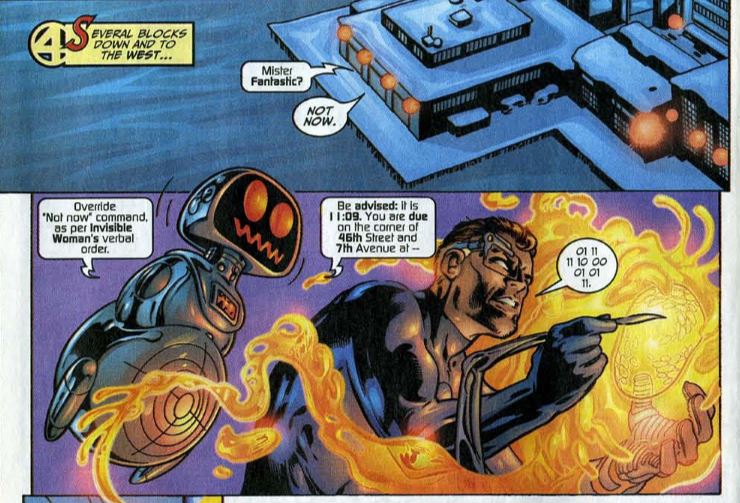 Fantastic fifth wheel: H.E.R.B.I.E. the robot has been demoted to the team’s answering machine. Sue has programmed him not to respond to Reed’s “not now” when he calls, but Reed counters that with a code that automatically deactivates H.E.R.B.I.E. (Freakin’ H.E.R.B.I.E. the robot.)