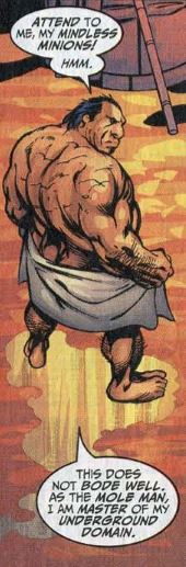 Then, somewhere in the mountains of Tibet, two explorers come across an ancient monastery. They find a bunch of dead bodies inside and then they’re confronted by a man in the shadows who calls himself Crucible. Cut from there to Subterranea, where the Mole Man is getting out of a bath (!) to discover all his minions have disappeared. He senses a monster crawling up from the depths of the planet, and he says that although he doesn’t care about the surface world, he will fight with his dying breath to save his people.
