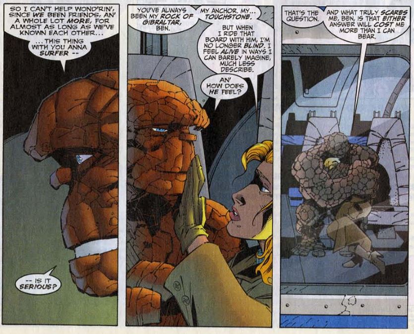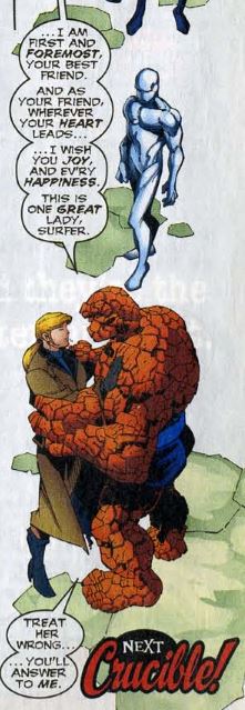 Ben is wracked with sadness, thinking that Alicia and the Silver Surfer look like they were meant to be together. But he then puts on a brave face and says no matter what happens, he’ll always be Alicia’s friend, and will always be there for her if she needs him. He then adds a warning for the Surfer, “Treat her wrong… you’ll answer to me.”