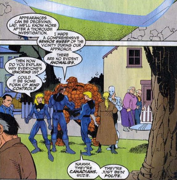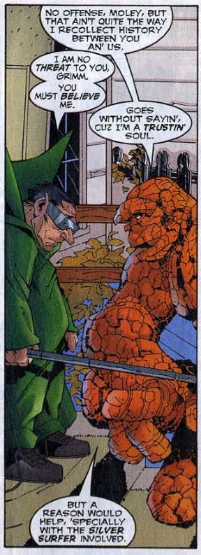 The heroes arrive in the small town of Yorkton, Canada, where the Surfer, once again in a weakened state, follows his instincts as why he’s been driven there. The heroes can find no anomalies of any kind in the seemingly normal town. It’s only then that the Mole Man steps out of a nearby building. He makes a big speech about the superiority of the underground kingdom, but Ben talks him out of a fight.