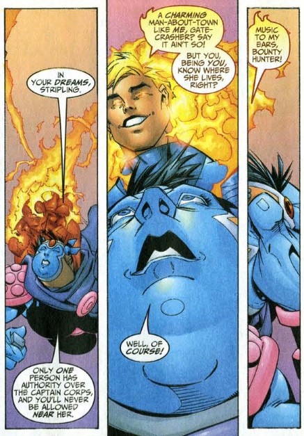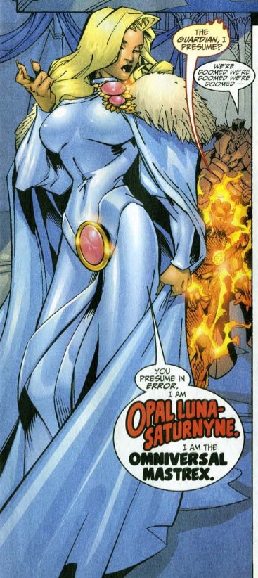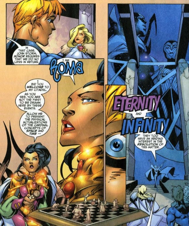 Through unknown means, Johnny and Gatecrasher arrive at the Starlight Citadel, an otherworldly place that can view every plane of the omniverse. Inside, Johnny comes face-to-face with Saturnyne, who introduces herself as the “omniversal mastrex.” Gatecrasher adds that Saturnyne “represents absolute power over all the worlds in the infinite tapestry of being.” Turn the page, and we see Roma is also present. The daughter of Merlin, Roma is the “omniversal guardian,” and this citadel is her home. Then two more cosmic beings appear, Eternity and Infinity. Remember that Eternity is living embodiment of all existence at once, and Infinity is the living embodiment of time. Roma says they have an abiding interest in what is about to occur. Further, it was Roma and not Saturnyne who sent all the bounty hunters after Franklin.
