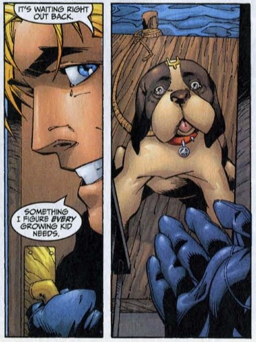Back at the pier, the FF are wrapping up the interview, while Sue is once again concerned about Franklin being unprotected. Then Johnny, Spider-Man and Caledonia return with the monster. It’s an Inhuman dog, similar to Lockjaw, except smaller. Franklin and the dog immediately bond, and I guess this means he’s got someone watching his back now.