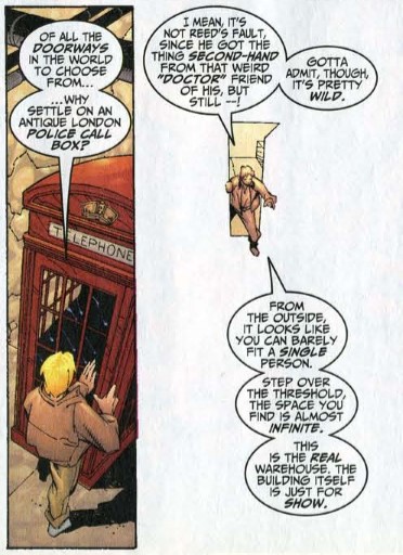 The bit with the English phone booth goes unexplained. It’s obviously a reference to Doctor Who, but Marvel’s short-lived Doctor Who comic was its own timeline that never crossed over with the regular Marvel Universe. Johnny says the phone booth came from Reed’s “strange doctor friend,” which has some fans speculating it came from Dr. Strange instead.