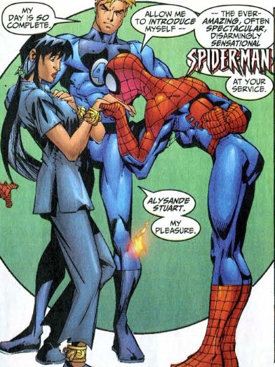 The mystery woman finally gives her name, Alysande Stuart. (Marvel fans no doubt remember another Alysande Stuart who was a main character in Excalibur for a while. That Alysande died in Excalibur #55, and this new one is an alternate universe version.) Spidey saw Johnny’s flame and thought they should have a proper reunion after Johnny came back from the dead in Heroes Return.