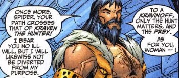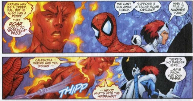 Johnny, Spider-Man and Caledonia all fight Kraven. Although outnumbered, Kraven puts up a good fight with a dart gun and a bunch of other hunting gadgets. A loud roar comes from deeper within the building, and everyone realizes there’s a dangerous animal nearby. Kraven runs off, saying he’ll come back for the beast after it is done killing the three heroes. Caledonia, however, marches ahead to confront the monster, saying there is nothing to be afraid of.
