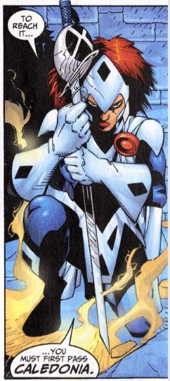 While Johnny and Spider-Man joke around, Alysande gets upset and runs off into the building. The two heroes follow her. There’s another short scene back at the pier with the interviewers, then it’s back to the former HQ, where Spider-Man finds Kraven the Hunter inside. Spidey refers to Kraven as “Alyosha,” revealing this is Alexei Kravinoff, mutant son of the original Kraven. He tells the heroes that they are not his prey, and he tells them to leave. Then Alysande says she is the protector of Kraven’s prey. Alysande strikes her knife to the ground which magically transforms her into an armor-clad warrior woman named Caledonia.