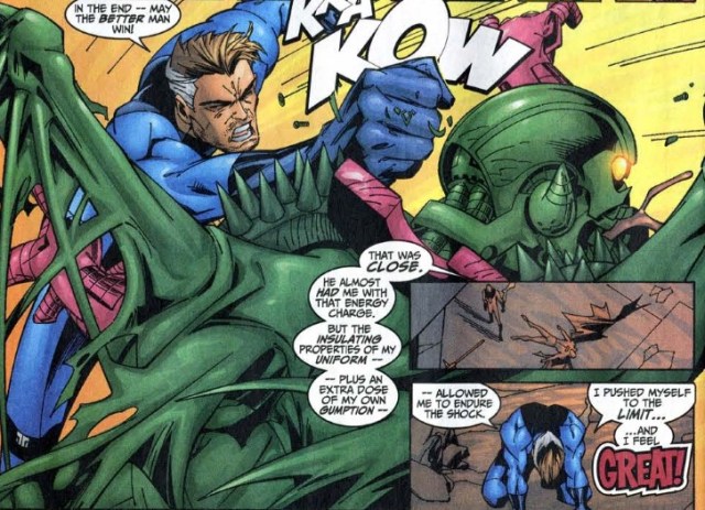 Feeling that he’s fallen into a rut Reed asks his computer to activate an exercise program – revealing that this is a holodeck in all but name. He creates a simulation of New York under attack by Annihilus, Blastaar, and Terrax. This holo-fight goes on for several pages, with Reed finally winning. He collapses with exhaustion, saying he pushed himself to the limit, and it felt great.