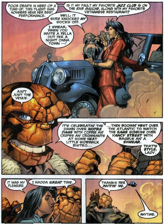 Just before dawn, Reed checks on sleeping Franklin, and Franklin’s new pet, an alien dog Franklin has named Puppy. Reed ponders how science used to be his whole life, but now his family is his reason for being. Nearby, Ben and super-genius Alyssa Moy return from a sightseeing trip to Paris, courtesy of Alyssa’s flying car. She gives him a kiss on the cheek before flying off. He catches up with Johnny who is trying to figure out how to free the FF’s other new female ally Alysande Stuart of the gold shackles she apparently can’t remove. Whatever the shackles are made of, they cannot burn. Alysande, we learn, was a slave (!) in her home dimension, before the FF brought her to Earth.