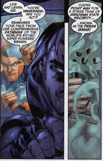 Reed hails a cab to take him to his teaching gig at Empire State University, only for the cab driver to flip a switch and trap Reed inside. As the inside of the cab fills with poison case, Reed says he recognizes the driver as Hawkshaw, a mutant from Genosha who leads a group of villains called the Press Gang. Reed provides exposition, saying the Press Gang has only ever been interested in hunting down mutants who emigrate from Genosha. Hawkshaw doesn’t give a proper answer, only to be joined by two other members of the Press Gang, Punchout and Jenny Ransom.