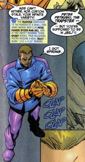 Paste Pot Pete, um, I mean the Trapster mentions he was just “sprung” from jail. He was locked up after confessing to the murder to a criminal Joey Z. in Spider-Man #92. It was later revealed that Norman Osborne was the real killer.