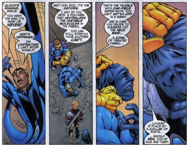 Reed manages to fight off all three of the Press Gang, only to confront their co-conspirator, the Trapster, formerly Paste Pot Pete. Reed fights all four baddies, evading the Genoshans, and not proving no match for the Trapster’s glue. Except that he isn’t. After knocking out the Press Gang, Reed loses the ability to shape-shift. The Trapster says his glue coated Reed’s uniform with polymer that stabilizes the unstable molecules, meaning Reed and stretch, but his clothes can’t. He wraps a similar fabric around Reed’s head and proclaims his victory.