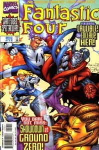 Reed and the Magistrate travel through one of those portals, and find themselves in the headquarters of the Enclave. Remember them? They are three mad scientists who have been causing trouble around the Marvel Universe since back in the Stan Lee/Jack Kirby days. The attacking military goons are the Enclave’s troops. Reed says that the Enclave originally wanted to create a new lifeform from scratch, but now they’re experimenting on humans. Then Crucible appears, unmasked. He’s really Morlak, one of the Enclave! He and Reed fight for a bit, until Morlak is shot by Shinski, a second Enclave, who then dons the Crucible armor and proclaims that he’s the real Crucible.