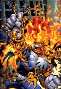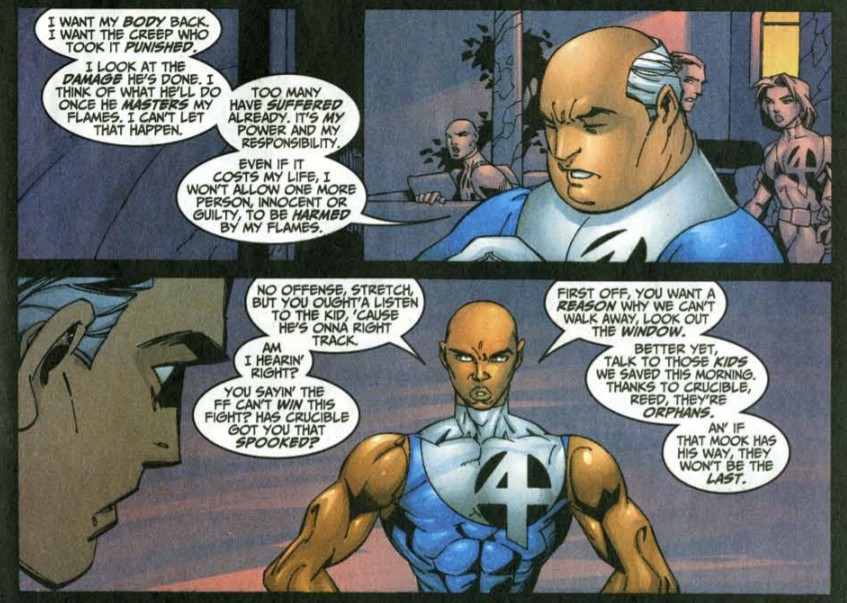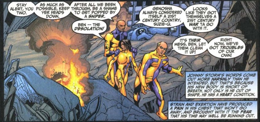 Recap: After Reed was captured by Genoshans, the rest of the FF flew to the island nation of Genosha to rescue him. There, they confronted supervillain Crucible, who brain-switched Sue, Ben, and Johnny, with three non-powered ordinary humans. This issue begins with the Genosha capital city Hammer Bay under attack by high-tech aircraft. The FF make their way through the rubble. Ben is in the body of a tall bald guy, Sue is now an 18-year-old girl, and Johnny is an old man. Johnny’s doppleganger used his all-powerful nova flame to destroy a building last issue, and Johnny blames himself.