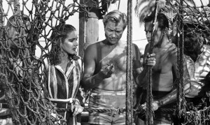 Monster! The look of the Creature, designed by artist Millicent Patrick, is terrific. Out of the water, he’s all wet and glisten-y, and his neck bulges as he breaths, suggesting gills. In the water, we actually see him swim around, making us believe that he really does live in this hidden lagoon.