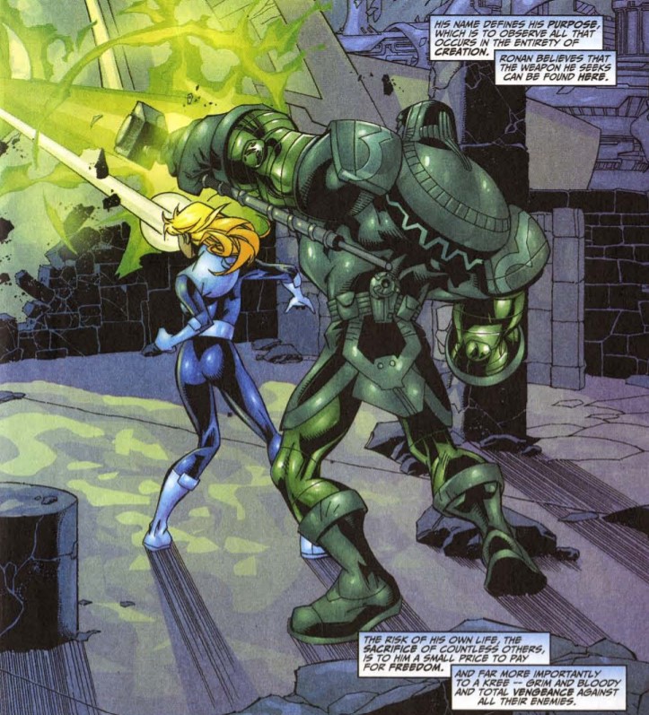 Recap: Ronan the Accuser returned to Earth and picked a fight with the FF, ending with him using an alien called a “mannequin” to mind-control Sue. He and the FF teleported to the Blue Area of the Moon, where Ronan plots to break into the Watcher’s home and steal the advanced alien tech inside. Reed, Ben, and Johnny defeated three Kree criminals Ronan sent after them and now they’ve regrouped. As this issue begins, Ronan explains that the Kree have recently been conquered by the Shi’ar, so he needs the Watcher’s tech to properly mount an resistance.