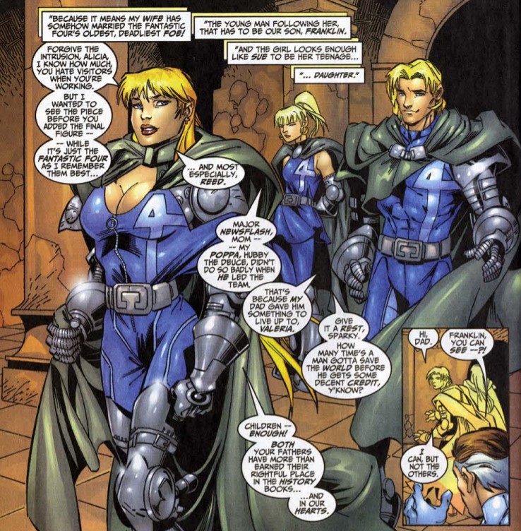 What happens next is a little confusing. Reed, Ben, Johnny, and Charlotte pass through some strange energy pulses, and then enter a room to find Alicia there, working on a large sculpture of the FF. Caledonia is there, wearing an FF uniform, and she’s joined by Sue, who is introduced as “Baroness Von Doom.” The explanation is rushed through pretty quick, and it’s that this tunnel they’re in contains “pockets of warped time,” which apparently include alternate timelines. Alt-Sue enters wearing Dr. Doom-like armor, joined by a grownup Franklin, and a daughter… Valeria!