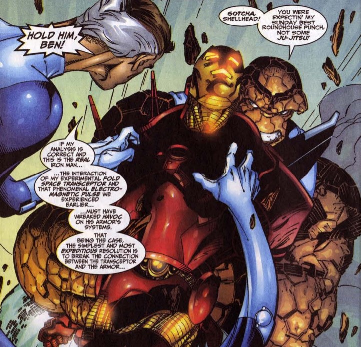 Clobberin’ time: Ben wraps his arms around Iron Man instead of punching him, claiming that this is his “ju-jitsu” [sic] skills. I’m going to assume that Ben is joking, as he’s never been shown to be any sort of martial arts master before this.
