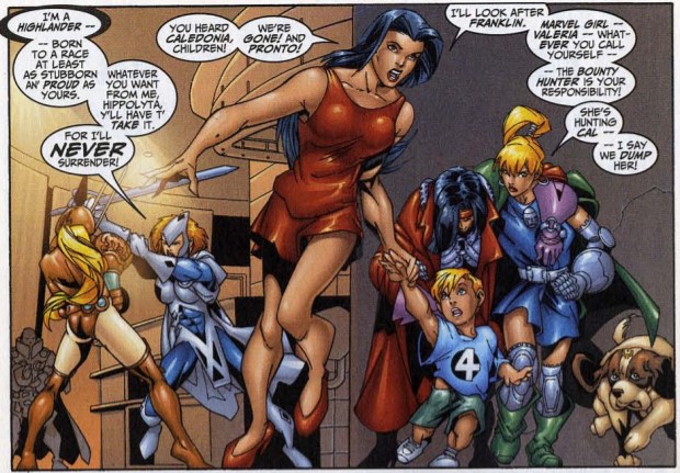 Hippolyta, with help from the captions, explains that the Bacchae are seeking revenge from when the FF and Caledonia interrupted a fight between the Bacchae and criminals named the G0-Gang. (This occurred in a single page, seemingly out of nowhere, in vol. 3 #7.) Caledonia fights Hippolyta and the Bacchae, while Alyssa and Valeria lead Franklin, Puppy, and a stunned Bounty to make a run for it.