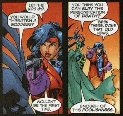 Hades teleports himself, Caledonia, Hippolyta, and the Bacchae away, leaving the rest inside the now-empty nightclub. Bounty comes to and agrees to help the new team in finding Caledonia. Valeria convinces Puppy to track Caledonia’s scent and teleport them to where she went. (I guess it’s some kind of psychic “scent.”) The trail leads to Hades… and the Underworld.