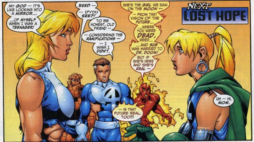 Then Hercules arrives with the FF, alongside Hades’ wife Persephone. She tells him to call of the attack, and they retreat farther into the Underworld, taking Hippolyta with them. Then Sue and Reed meet Valeria for the first time. Johnny reminds everyone of the alternate future the FF witnessed during their fight with Ronan a while back, in which Reed was dead and Sue had married Dr. Doom with a daughter Valeria. As he wonders if this means that future will come to pass, Valeria ends the issue with a simple, “Hi, Mom.”