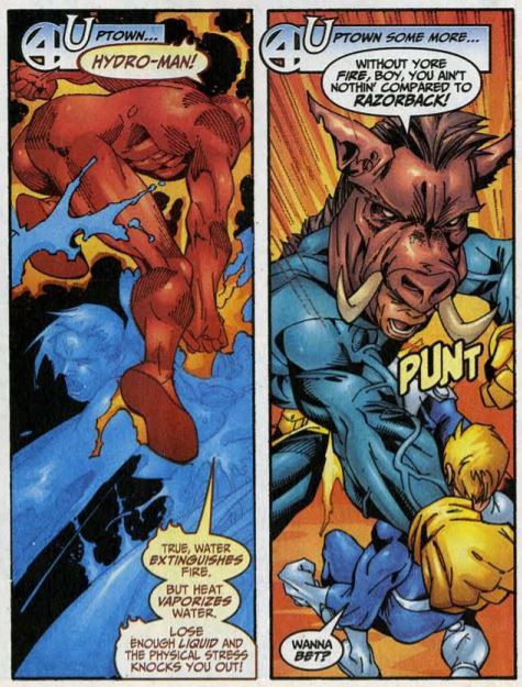 Flame on: Johnny battles Hydro-Man and Razorback while running around playing vigilante. Hyrdo-Man was all over the place during this, with short-lived alliances with the Masters of Evil, A.I.M., and the Maggia. Razorback’s cameo is more puzzling, as he was a good guy at this point, and he was out in space having space adventures. The Marvel Wiki states he and Johnny are fighting under “undisclosed circumstances.”
