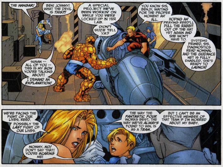 Later that night, an alarm goes off, and Reed deduces that that the chaos storm’s timetable has increased at a tremendous rate. Sue snatches Franklin from his bed, and Reed asks where she is taking him. In the hangar, Sue and the others have prepared a rocket ship just for Franklin, without Reed’s knowledge. They are sending Franklin away to another world to protect him from the chaos storm. Sue doesn’t say what world, but that she “called in a marker.” Caledonia and Puppy join Franklin to act as his bodyguards.