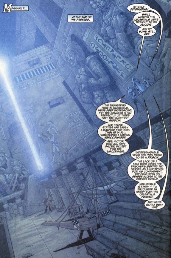 The Celestial destroys Doom’s ship, and everyone is teleported to the American Southwest, where the Celestial has a giant underground headquarters (!). Sue exposits that the Celestials agreed to leave the Heroes Reborn universe in peace, under the care of Ashema, a fellow Celestial. Doom explains that this is the Dreaming Celestial, who has gone rogue from the rest of the Celestials. He’s the one hoping to merge the two universes, for no reason other than he is driven toward chaos and destruction.